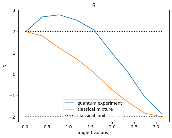 As we all know, the experiment proved quantum mechanics right and the sceptics wrong. There is ‘ spooky action at a distance’. The fun thing is that nowadays very accessible tools are available to experience this ourselves. To model the Aspect experiment in Python you can check out the Jupyter Notebook( https://robhendrik.github.io/Bell-test-simulation/) where below graph is made. The parameter S on the vertical axis is exactly the ‘S’ used above. We see that if we run a quantum experiment for certain settings of the detectors (i.e., for a given angular alignment) this S goes beyond the classical limits. If we do the same experiment with a classical mixture we get the same result as for our coin game and limit ‘S’ to values between -2 and 2.