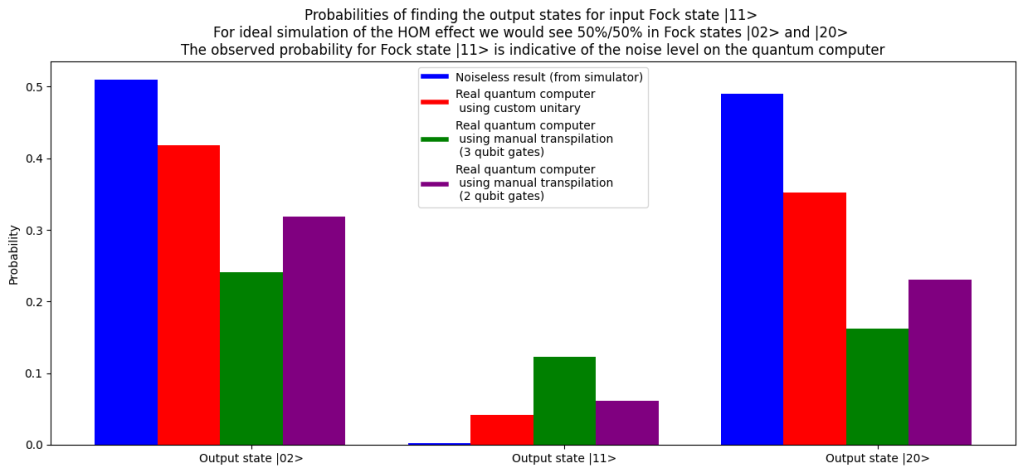 If we look at the quantum HOM effect specifically we can see how much the result on the real quantum computer shows that the outcome is suppressed. For all runs on the real quantum computer we see a non-zero probability to go from