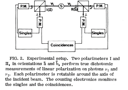 Intermezzo: There can be confusion on the ‘name’ used to distinguish the various forms of the Bell inequality. The original inequality mentioned in Bell’s 1965 paper is quite clear, although the paper is also sometimes referred to as the 1964 paper. The abbreviation CHSH stands for John Clauser, Michael Horne, Abner Shimony, and Richard Holt who jointly published their paper in 1969. The exact form seen nowadays does however only show in the 1974 paper by John Clauser and Michael Horne. Interestingly, in the 1974 paper John Clauser and Richard Horne state that this form of the inequality comes from John Bell himself although not explicitly mentioned. (“Bell does not write Eqs. (B1), but this definition is implicit in his discussion.”). So whether the CSHS inequality now originates from Clauser, Horne, Shimony, and Holt, from John Bell or was first noted down by Clauser and Horne cannot be traced back from formal literature. Also in exact form we see both the CSHS inequality and the CH74 inequality both for the first time in the 1974 paper.