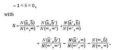 At first sight we could think that the value for is bound between -3 and 3 because any of the terms is bound between -1 and 1. Closer inspection shows that the range is smaller. For every individual turn either bi=bi’ (and bibi’ = 1) or bi=-bi’ (and bibi’ = -1). In the first case either ab = ab’ = 1, or ab = ab’ = -1. In the second case either ab = 1 and ab’ = -1, or ab = -1 and ab = 1. In any case the possible outcomes for the total ab + ab’ + bb’ is larger than -1. The outcome -3 never occurs as it would require b to be different from b’, and a to be different from b and b’ at the same time. But if we know that b and b’ are different we know that a has to equal to at least one of them. So we logically derive: