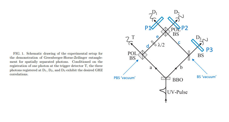 Now all the polarization orientations can become confusing, so let’s write out analysis in some more detail. We start with the GHZ state which should be generated in the experiment.
