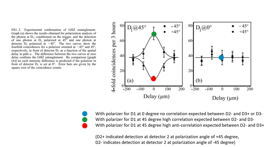 So IF we detect a photon at the trigger and at D1 at 0 degree we see no correlation between the diagonal polarization for detectors 2 and 3. If we detect a photon at D2+, we are as likely to find one at D3- as we are to find one at D3+. This is depicted in the right hand graph in Figure 2.