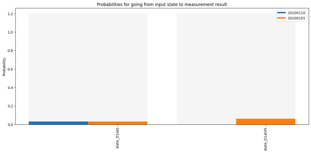 The two states have the same optical component (). The differece between the two input states is in the classical channels 8 and 9 (which set the orientation of polarization for detector 1). For the state ‘state_D1at0’ these values are such that we detect for D1 horizontal and vertical polarization. For the state ‘state_D1at45’ we detect for D1 at the diagonal directions +45 degree and -45 degree. Using a controlled phase plate in the circuit means we can evaluate the two settings with one collection of states, rather than having to create two separate circuits for the two settings.