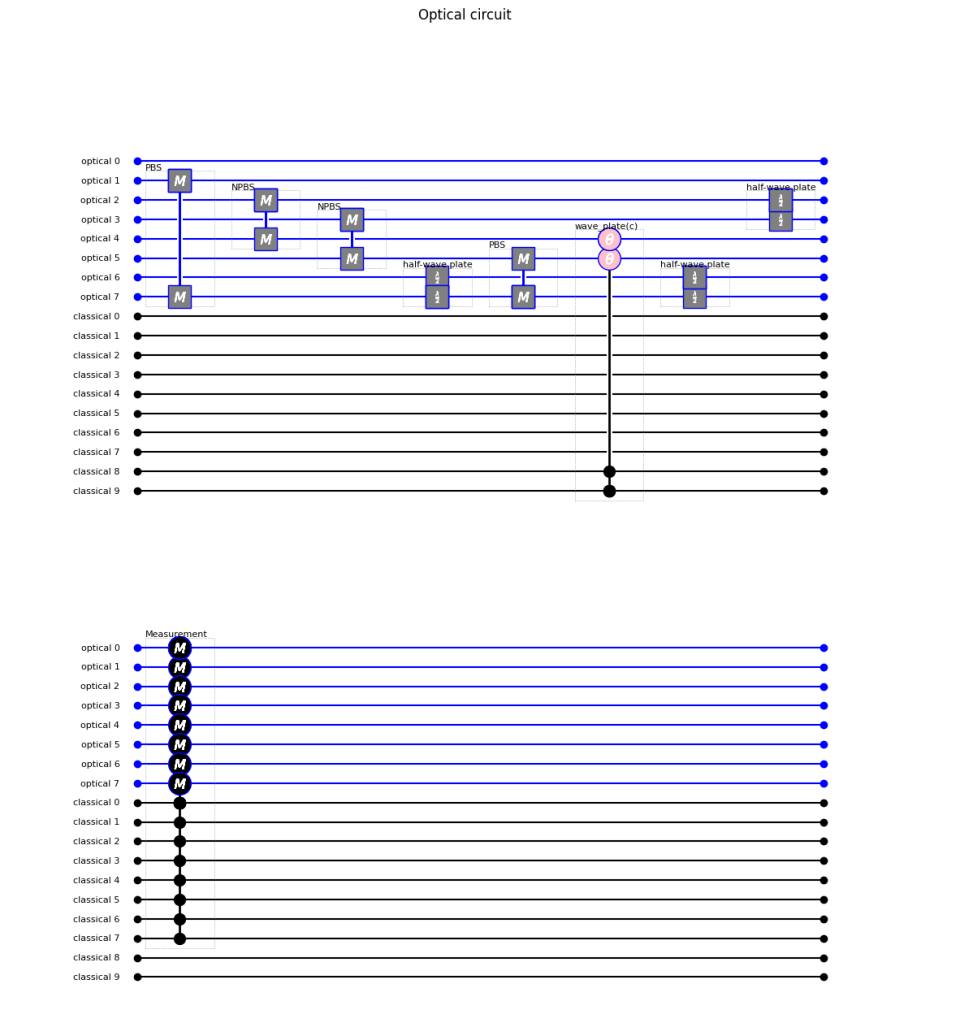 As we want to run the circuit with the polarizer in front of detector 1 at 0 degree and at 45 degree we use a special optical component, which is ‘classically controlled’. It means that we use the values in the classical channels to set the orientation. For this reason we add two classical channels to the circuit, bringing the total number of classical channels to 10. The no_of_classical_channels is set to 10.
