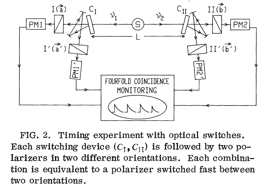 When Alain Aspect began his research, groups in the USA had performed experiments on Bell’s inequalities [5]. Entangled photons had already been observed in the 1940 [6]. John Bell had already proposed that for a foolproof demonstration, he would have to change the orientation of the detectors faster than the time light takes to travel from the source to this detector. This meant he had to switch detectors within 0.01 millionth of a second. None of the other research groups could accomplish this task, so Alain Aspect took up the challenge.