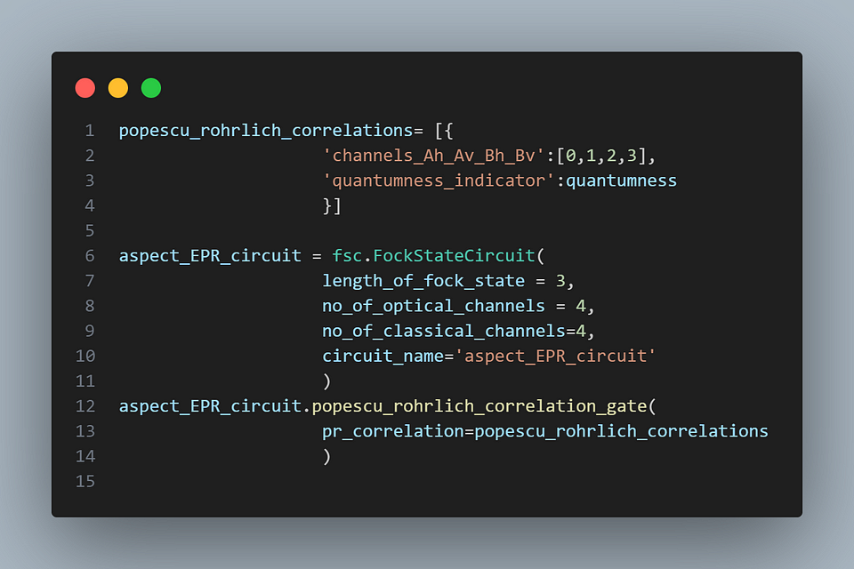 We use the same EPR optical circuit as in the FockStateCircuit tutorial [8]. The change we made is that we added ‘no-signaling boxes’ as input states, replacing the regular entangled state. On the output side, we need to evaluate the result with a dedicated function to capture the result. The code snippet below shows how these functions are called (for the complete code, see GitHub for the Jupyter Notebook belonging to this post).