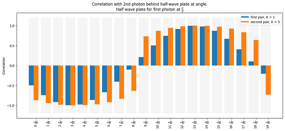 - If the half-wave plates are aligned, we expect perfect correlation, and if the wave plates are at an angle of 45 degrees, perfect anti-correlation. At 22.5 degrees between the wave plates, we expect no correlation. These conditions should hold for all q-values.