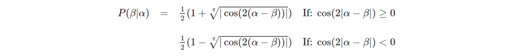 The function P(β|α) is the probability of detecting the second photon at a polarization angle β, given that we detected the first photon at a polarization angle α. P(β|α) = cos(α-β)² for quantum mechanics. Note that the probability only depends on the difference between the angles.